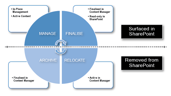 This need could arise due to the lifecycle of the documents or the SharePoint site. For example, once a project is completed, it can be archived into Content Manager, removing it from SharePoint and starting the lifecycle management process for these documents and objects.